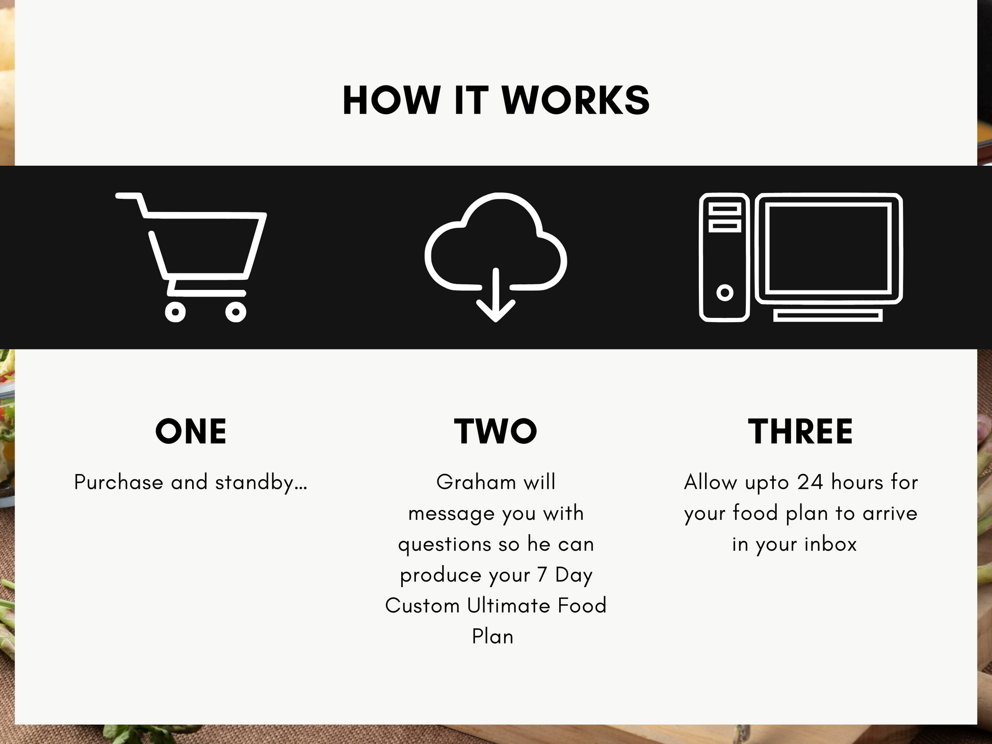 Please allow up to 24 hours for your Custom Food Plan to arrive in your inbox, message Graham direct if you have any questions.